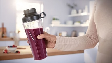 Komfort fra begynnelse til slutt. Takket være en ToGo-flaske som skrus på plass er monteringen så enkel som mulig, med tydelig lydeffekt som Rengjøringen er også rask og lettvint takket være deler som kan vaskes i oppvaskmaskin. Avtagbare blader gjør det hele enda enklere.