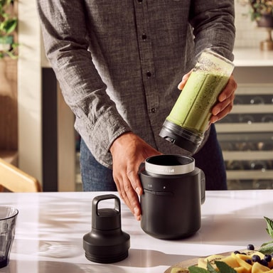 Opplev bekvemmeligheten med KitchenAid Go batteridrevet blender 5KSBR200BM. Apparatet leveres med en 473 ml mugge og to enkle knapper for puls og strøm. De asymmetriske knivene i rustfritt stål sørger for effektiv blending.Les mer om produktet
