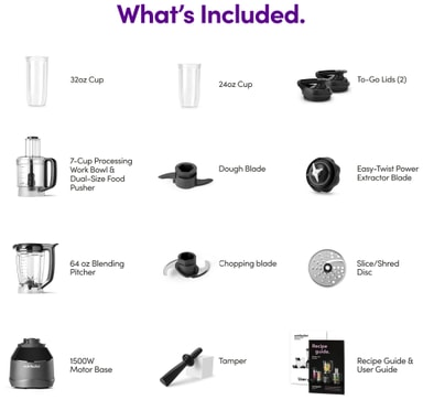 Inkluderer en fullstørrelse kanne, nutriblender-kopper og matprosessorbeholder med blader - dekker alle dine tilberedningsbehov i ett system.