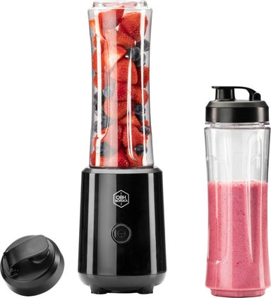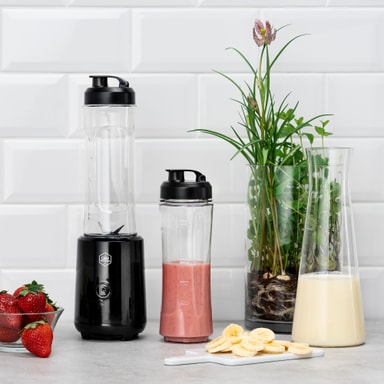 To flasker på 0,6 liter følger med, bruk dem for å ta med deg en smoothie på tur eller som frokost på kontoret.