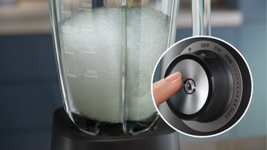Alle de avtakbare delene av blenderen kan vaskes i oppvaskmaskin for ekstra bekvemmelighet, og enheten leveres med et ett-trykks rengjøringsprogram. For å rengjøre den trenger du bare å tilsette varmt vann og såpe i glasset og aktivere rengjøringsfunksjonen.