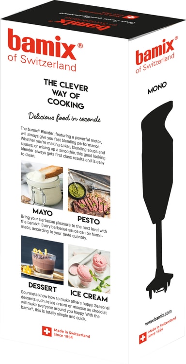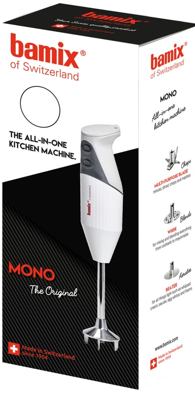 bamix® Mono-stavmikser med en kraftig motor på 200 watt, slik at du får pålitelig hjelp til selv de mest krevende oppgavene på kjøkkenet. Stavmikseren har to hastigheter, softgrip-sikkerhetsknapp og en praktisk ledning som gir masse fleksibilitet. Produktet leveres med multifunksjonskniv, blenderskive, vispeskive, beholder med lokk 600 ml og veggholder samt en bruksanvisning. Livstidsgaranti på motor. Med bamix® Mono og tilbehøret kan du vispe, lage puré, røre, blende, mikse, mose, knuse og hakke.Motoren er en kraftig vekselstrømsmotor, som samtidig er ekstremt stillegående. Overføringen med kniven er skrudd direkte på motoren. Det betyr at strømmen konverteres til imponerende effektivitet.Gode grunner til å velge bamix®:• Løser de fleste kjøkkenoppgaver, og kan brukes i varme gryter.• Trekker ingrediensene inn i bladet, sprøyter ikke, og suger seg ikke fast i bunnen av beholderen.• De fire beina gjør at bunnen i beholderen ikke blir skadet.• Maskinen rengjøres enkelt – du trenger bare å skylle den i varmt vann. Absorberer ikke lukt eller farge.Last ned Bamix-appen og få inspirasjon til mange gode oppskrifter.