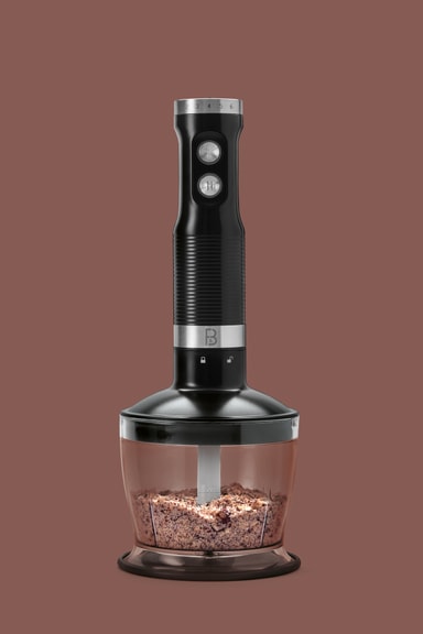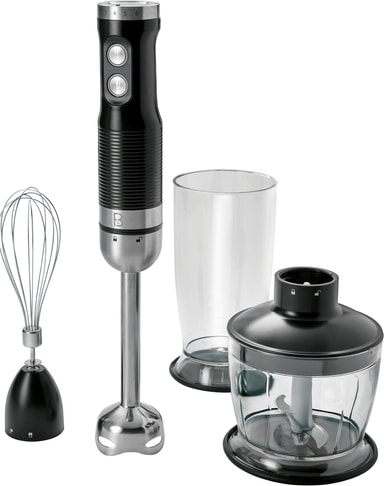 Med F&Bs håndblendersett har alt du trenger for problemfri miksing og blending, da det kombinerer en blender med en 1000-watts motor med to hastigheter og et sett med anvendelig tilbehør bestående av en hakker, en visp, og et målebeger som tar opp til 500 ml, tilbehøret låses på plass med en liten skru.