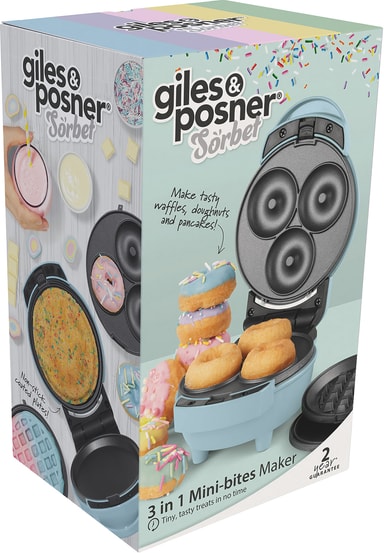 Giles & Posner 3-i-1 Mini snackmaskin 500021 lar deg enkelt lage vafler, pannekaker og smultringer. Den har utskiftbare klebefrie plater, varmes opp på tre minutter og er kompakt, for enkel oppbevaring.Les mer om produktet