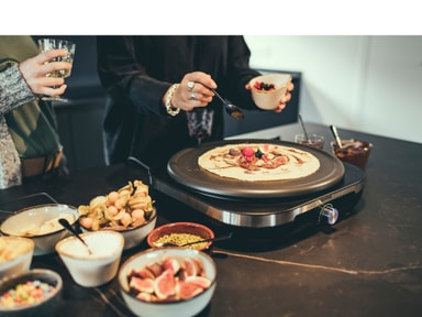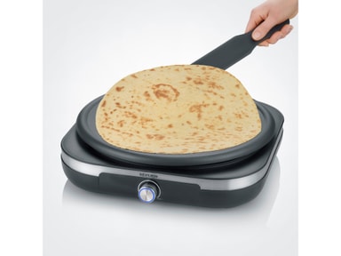 Bruk denne crepepannen til å lage tynne crepes, sprø pannekaker eller deilige tortillaer. Pannen har god varmefordeling og et praktisk nonstick-belegg som sørger for at røren ikke brenner fast. Deigfordeler og spatel medfølger. 1500 watt.CM 2199Les mer om produktet