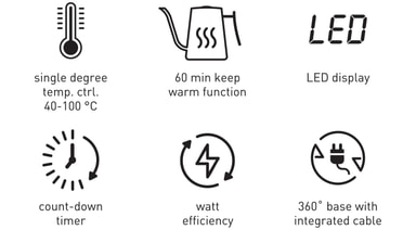 En innebygd hold varm-funksjon opprettholder ønsket temperatur i opptil 60 minutter, noe som gjør det praktisk å helle en ny kopp uten å måtte varme opp på nytt.