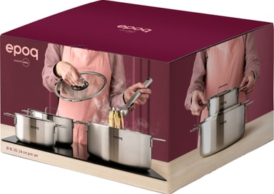 Epoq by Woll kasserollesett - 24 cm, 20 cm, og 16 cm deler gir jevn varmefordeling og kommer i et elegant design. Det er fullt kompatibelt med platetopper, inkludert induksjon. Settet tåler stekeovn og oppvaskmaskin for enkel matlaging og rengjøring.Les mer om produktet