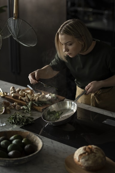 Håndtaket i rustfritt stål tåler ovnstemperaturer opp til 270°C, slik at du enkelt kan flytte pannen fra kokeplate til ovn uten å bytte kokekar.