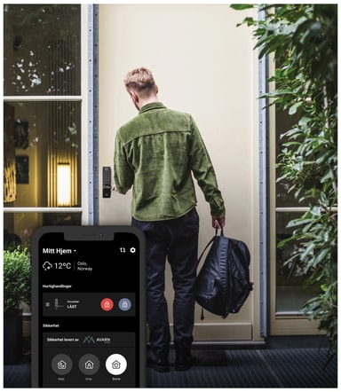 Lås og lås opp døren på den måten som er mest praktisk for deg. Du kan velge en PIN-kode, sømløs åpning ved hjelp av fingeravtrykk eller gi nøkkelbrikker til alle i familien. Om et strømbrudd skulle oppstå, kan du problemfritt låse og låse opp døren med en tradisjonell nøkkel. Når du er tilkoblet til Heimgard Hub, kan du også bruke mobiltelefonen.