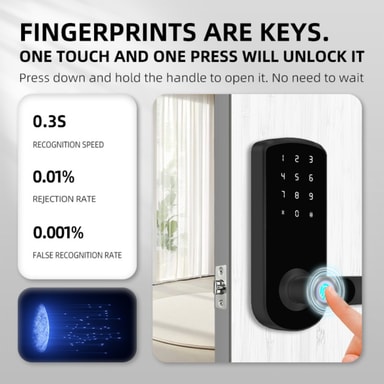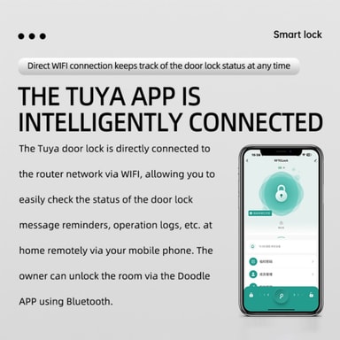 Sikre hjemmet ditt med Smart Dørlås Fingeravtrykk Tuya. Har TTLock Bluetooth, fingeravtrykk, passord, NFC, kort, nøkkel og midlertidig passord opplåsing. Ideell for hjem, leiligheter, hoteller og skoler med innendørs tredører.Les mer om produktet