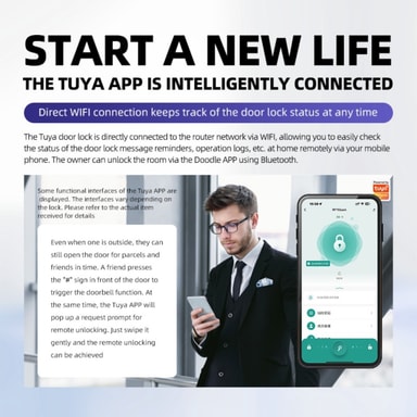 Fjernstyrt tilgangskontroll: Få full kontroll over din hjemmesikkerhet med Tuya WiFi Smart Dørlås. Denne smarte låsen lar deg fjernovervåke og administrere tilgangen til eiendommen din via Tuya-appen. Enten du er på jobb, reiser eller bare er borte fra hjemmet, kan du gi midlertidige tilgangskoder til gjester, leveringspersonell eller tjenesteleverandører. Motta sanntidsvarsler når døren låses eller låses opp, slik at du alltid er klar over hvem som kommer inn og ut av hjemmet ditt. Fjernstyringsfunksjonen gir enestående bekvemmelighet og trygghet, noe som gjør den til et viktig tillegg til ethvert moderne smarthussikkerhetssystem. Denne Tuya smarte låsen er kompatibel med forskjellige dørtyper, og tilbyr en sømløs integrasjon i ditt eksisterende oppsett.