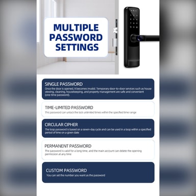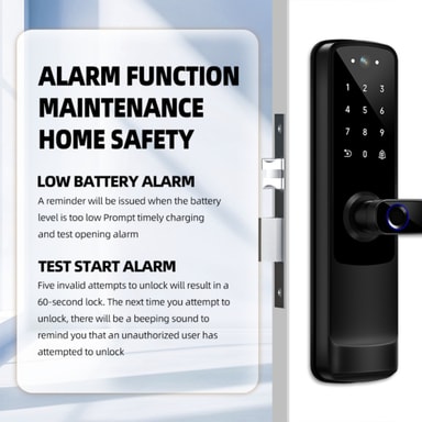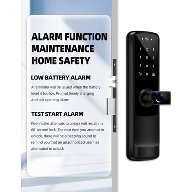 Flere opplåsingsmetoder: Opplev optimal fleksibilitet med Tuya WiFi Smart Dørlås sine flere opplåsingsmetoder. Velg mellom fingeravtrykkgjenkjenning, passordoppføring, RFID-korttilgang eller tradisjonell nøkkelopplåsing, som imøtekommer din foretrukne inngangsmetode. Den høypresise fingeravtrykksensoren sikrer rask og nøyaktig identifikasjon, mens den tilpassbare passordfunksjonen lar deg lage unike koder for forskjellige brukere. De inkluderte RFID-kortene gir et praktisk alternativ for familiemedlemmer eller gjester. I tilfelle nødsituasjoner eller glemte koder, tilbyr det tradisjonelle nøkkelopplåsingsalternativet en pålitelig reserveløsning. Denne allsidige smarte låsen tilpasser seg din livsstil, og gir en sømløs og sikker inngangsopplevelse hver gang. Tuya WiFi Smart Dørlås er designet for enkel installasjon og brukervennlig betjening.