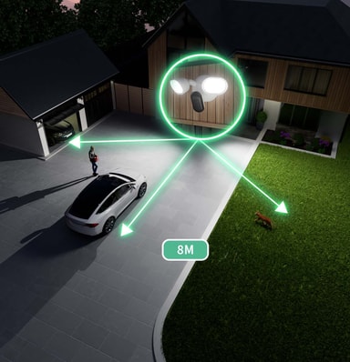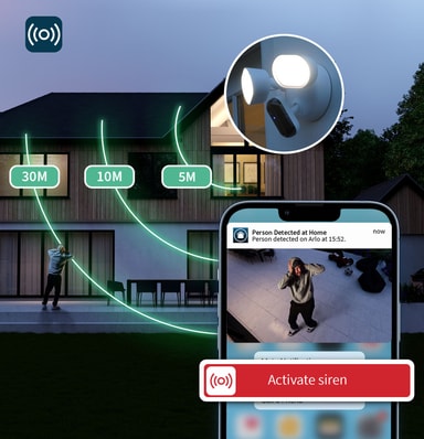 Det innebygde flomlyset og sirenen jobber sammen for å avskrekke inntrengere, og kan utløses automatisk ved bevegelsesdeteksjon eller manuelt via appen ved behov.