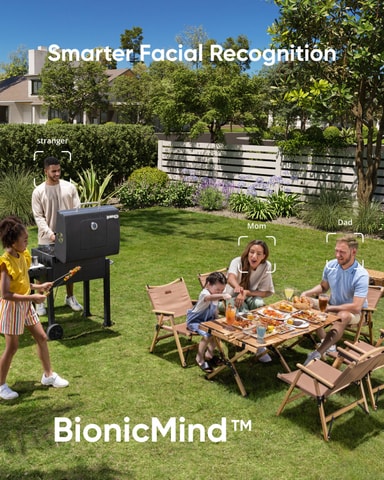 S220 SoloCam bruker avansert AI-teknologi for å oppdage menneskelig tilstedeværelse, og sender varsler til enheten din når noen kommer inn i det overvåkede området. Denne funksjonen forbedrer sikkerheten ved å skille mellom familiemedlemmer, kurerer og potensielle inntrengere. For enda mer presis identifisering kan kameraet kobles til HomeBase 3 for individuell ansiktsgjenkjenning takket være BionicMind.