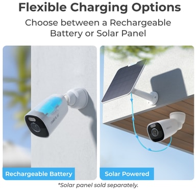 Overvåk omgivelsene uten behov for kabler da dette kameraet drives av et oppladbart batteri med opptil 4 måneders batterilevetid. Du kan også koble til et solcellepanel for nærmest ubegrenset strømforsyning. Solcellepanelet selges separat.