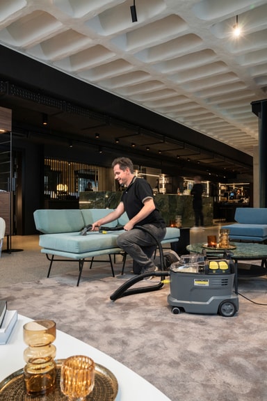 Apparatet bruker trykk for å sprøyte en rengjøringsløsning dypt inn i fibrene og deretter støvsuge den opp. Baksuget sørger for rask tørking, slik at du raskt kan bruke det på nytt.