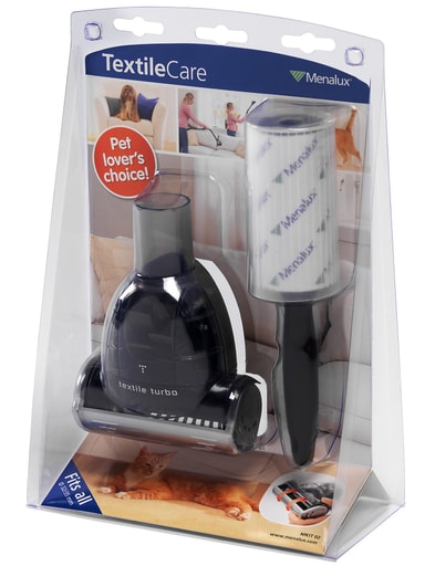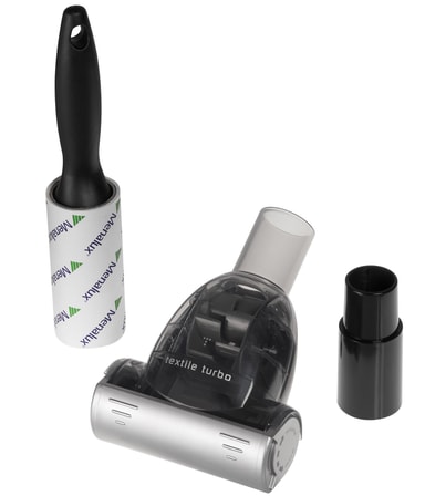 Mini Textile Turbo er et munnstykke for praktisk og effektiv rengjøring av møbler og gardiner mens klesrullen fjerner lo og hår.