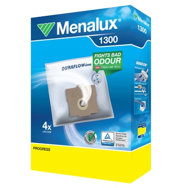 Menalux støvsugerposer 1300 passer støvsugere fra Hugin, Progress, Tornado, Volta og Wertheim. Pakken inneholder 4 stk. syntetiske Duraflow-poser + filter.