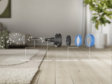 Den forbedrede sykloniske støvutskilleren minsker filterfortettelse, noe som resulterer i vedvarende optimal ytelse. Få opptil to ganger* lengre sugeytelse før du må bytte filter.