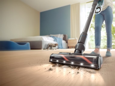 TriActive Smart LED-munnstykket tilpasser sugestyrken automatisk etter gulvtype. Innebygde LED-lys fremhever skjult støv, slik at støvsugeren kan fange opp mer smuss i én enkelt passering.