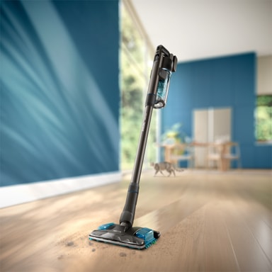 Philips 8000 Series SpeedPro Max Pet trådløs støvsuger XC8155/01er bygget for kjæledyrhjem, og kombinerer kraftig sug, anti-hårteknologi og smart LED-styrt rengjøring. Med opptil 80 minutters driftstid, kant-til-kant-rengjøring langs lister, et dedikert PetPro-munnstykke og et Aqua-munnstykke for støvsuging og mopping, rengjør den tørt smuss og vått skitt på én gang for raskere og dypere rengjøring i hele hjemmet.