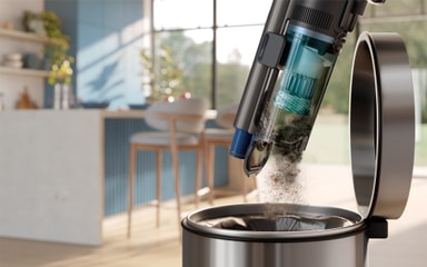 Støvbeholderen tømmes med ett trykk, slik at smusset kan tømmes på en hygienisk måte uten å fjerne beholderen eller berøre avfallet.