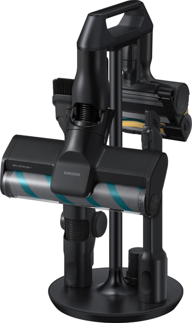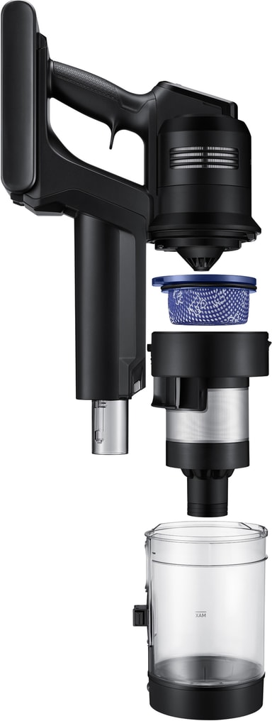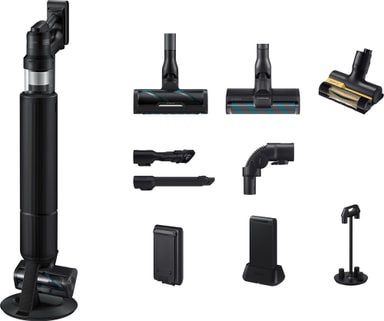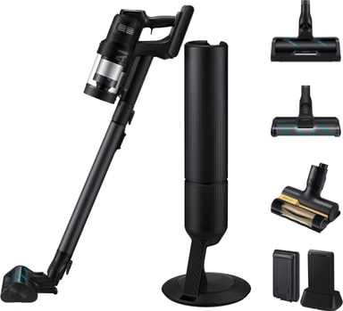 * 400 W sugeeffekt basert på en test utført av SLG Prüf- und Zertifizierungs GmbH 2024, i samsvar med IEC 62885-4 Cl.5.8-standarden, med en håndholdt støvsuger (uten børste) i Jet Mode og et batteri med stor kapasitet som er fulladet. Effekten varer i opptil 1 minutt. Testet utvalgte modeller av batteridrevne skaftstøvsugere med en angitt sugeeffekt innenfor 30 % av den faktiske sugeeffekten til Samsung-modellen som ble testet av SLG. Se hele testen på samsung.com.