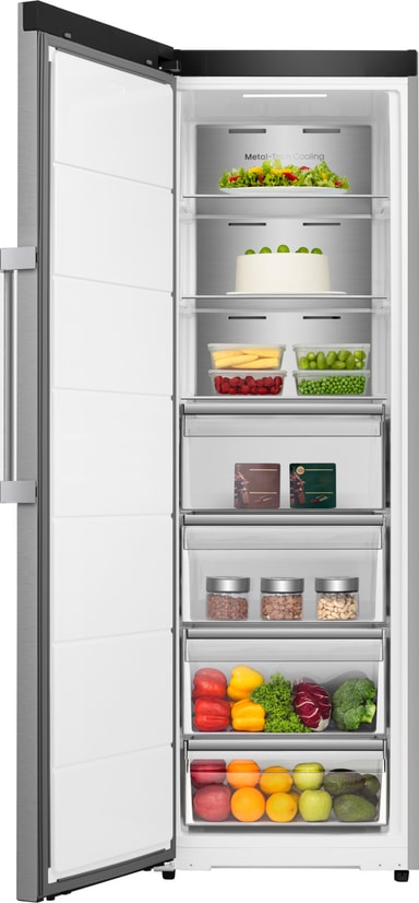 Med en dybde på 60 cm passer KitchenFit-kjøleskapet sømløst inn i kjøkkenskapene dine. Du får et moderne, integrert utseende - uten å måtte velge et helintegrert produkt. Passer i små og smale nisjer Takket være et smart design på hengslene kan dørene åpnes helt selv om kjøleskapet står nær skap eller vegger. Bare 2,5 mm klaring på sidene og 5 mm på toppen er nok. Full funksjonalitet, ingen kompromisser Alle skuffer og hyller kan trekkes helt ut, og du får mest mulig ut av plassen – perfekt for både nye og eksisterende kjøkken.