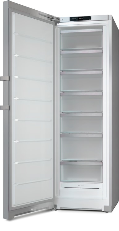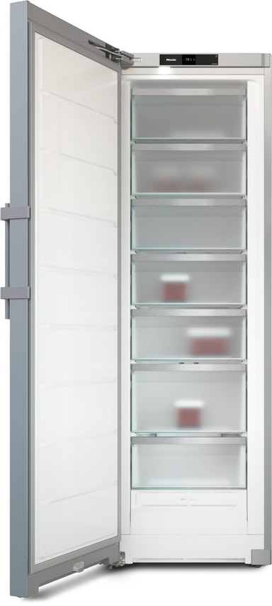 Miele-fryseren har et vakkert ståldesign som passer rett inn i ethvert kjøkken. Døren med eksternt håndtak kan enkelt åpnes for å vise de interne fryseskuffene.