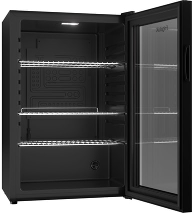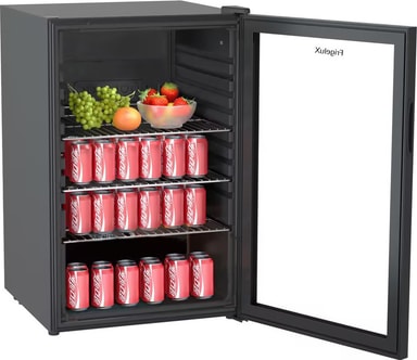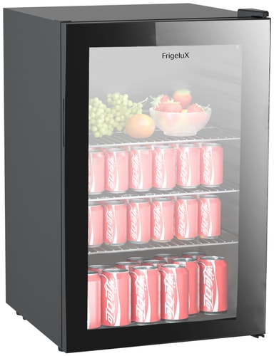 FrigeluX kjøleskap D115NV er utstyrt med et nettovolum på 115 liter. Den har et elegant sort design med en glassdør og kraftig, effektiv LED-belysning. Kjøleskapet er egnet for oppbevaring av øl, brus, vann og andre drikkevarer.