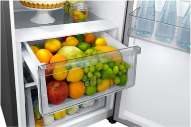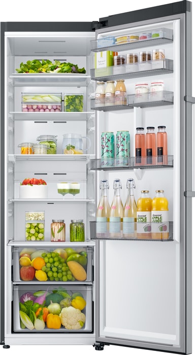 Hold maten din frisk lenger med Samsung-kjøleskapet RR39C7BG6S9/EF. Det har en kapasitet på 387 liter, noe som gir rikelig med lagringsplass. Frost-free-teknologien eliminerer behovet for manuell avising, noe som gjør vedlikeholdet enkelt og problemfritt. Fresh+-skuffen sørger for at frukt og grønnsaker holder seg friske. All Around Cooling-funksjonen sikrer jevn kjøling i hele apparatet.