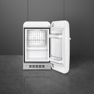 Smeg kjøleskap FAB5RWH6 i elegant hvitt har en kompakt høyde på 72,5 cm og bredde på 40,4 cm, med 2 hyller, justerbare føtter og stillegående drift på 36 dB, perfekt for stilig og plassbesparende kjøling.Les mer om produktet