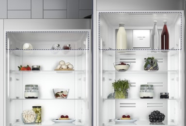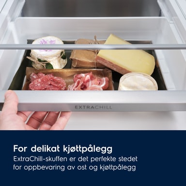 Beskytt kvaliteten, smaken og friskheten til kjøtt og oster i skuffen Extra Chill. Skuffen holder en lavere temperatur enn resten av kjøleskapet, med en aktiv sirkulasjon av kald luft.
