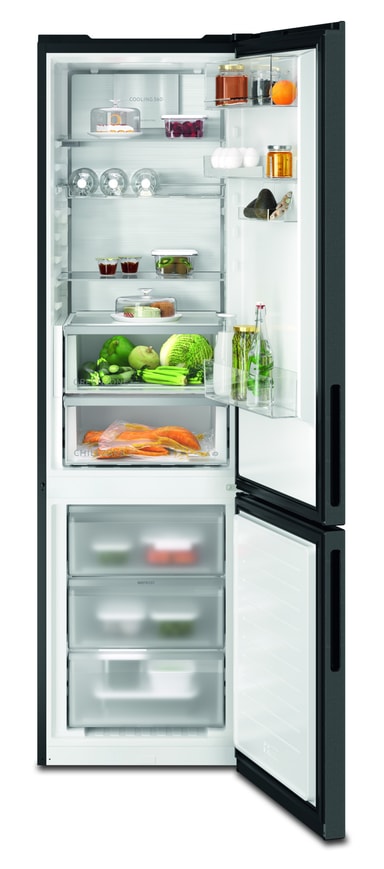 Kjøleskapet Cooling 360° tilbyr avansert luftsirkulasjon. Det spesialdesignede systemet sirkulerer kald luft i hvert hjørne gjennom velplasserte luftventiler. Bakplaten som er fremstilt av førsteklasses rustfritt stål kjøles ned raskere etter døråpning.