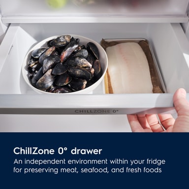 ChillZone 0°-skuffen er et eget miljø adskilt fra resten av kjøleskapet. Den har passende forhold for å bevare kjøtt, sjømat og andre ferskvarer.