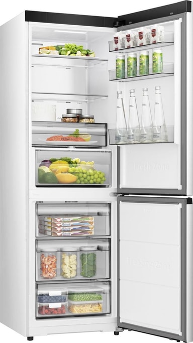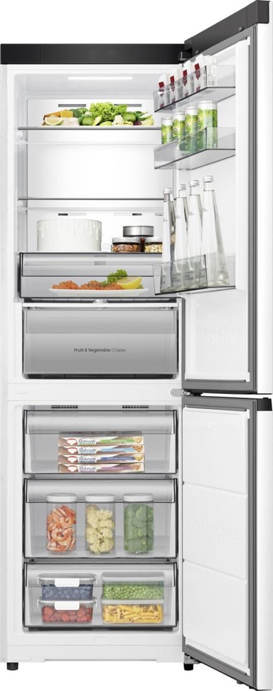 Selv om RB3K330SEWE er kompakt i størrelse (595 mm bred, 600 mm dyp), har den hele 330 liter oppbevaringsplass: 215 l i kjøleskapet og 115 l i fryseren. Innredningen er designet for fleksibilitet, med justerbare hyller og dedikerte soner for å holde alt på plass og lett å finne.