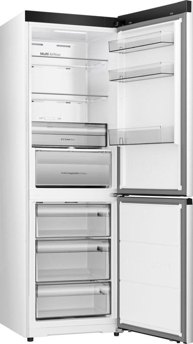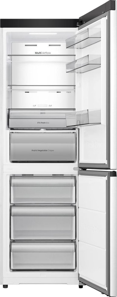 Denne modellen er utstyrt med et avansert bunnkjølesystem som sikrer jevn luftstrøm fra den nedre delen av kjøleskapet og oppover, noe som gir jevne, stabile temperaturer på alle hyller. Dette beskytter matvarekvaliteten og reduserer temperatursvingninger, slik at matvarene holder seg friske lenger. Det gir også et romsligere interiør, med færre hindringer og mer brukbart volum.