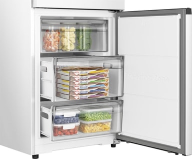 Fryseren er plassert i bunnen, slik at du har frysevarer innen rekkevidde. Dype uttrekkbare skuffer gjør det enkelt å organisere innholdet uten å måtte bøye seg ned eller grave gjennom stablede varer, enten det er frosne bær, brød eller rester.
