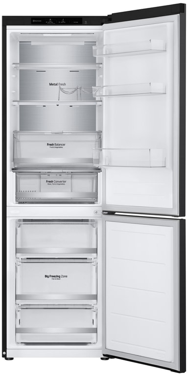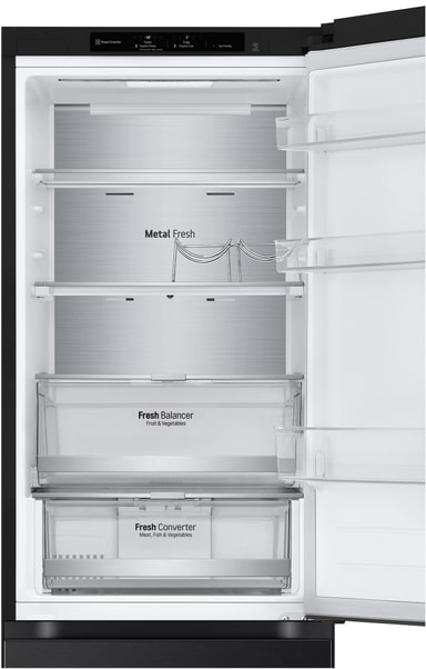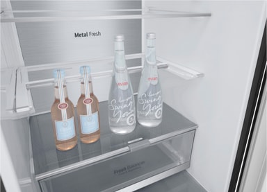 Den metallisk sorte veggen gir interiøret et tidløs, førsteklasses følelse. *Metal Fresh™ er et sammensatt ord som kommer fra ordene "metal laminated design" som står på lufteventil med kald luft og NatureFresh av Linear Cooling og Door Cooling+. *Bruken av metallkomponenter gjør ikke i seg selv at maten i kjøleskapet forblir friskere.
