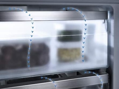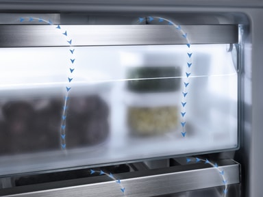 Med NoFrost-systemet trenger du aldri mer å rime av fryseskapet ditt. Omluftkjølingen fordeler den kalde, tørre luften jevnt, slik at det ikke dannes is inne i skapet. Dette gjør at det heller ikke dannes rim på frysevarene og skuffene kan enkelt åpnes og lukkes. NoFrost gir maksimal komfort ved frysing og sparer deg irriterende avriming – for alltid.