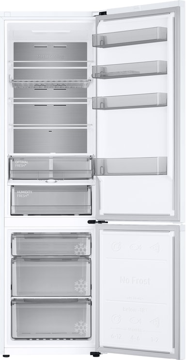 Samsung kombiskap RB38C705CWW/EF er den perfekte blandingen av et minimalistisk design og avanserte funksjoner som skaper ideelle oppbevaringsforhold. Nyt ferske råvarer, kjøtt og fisk lenger takket være OptimalFresh+- og HumidityFresh+-sonene, mens all-around-kjøling sammen med metallkjøling holder temperaturen stabil i hele skapet.