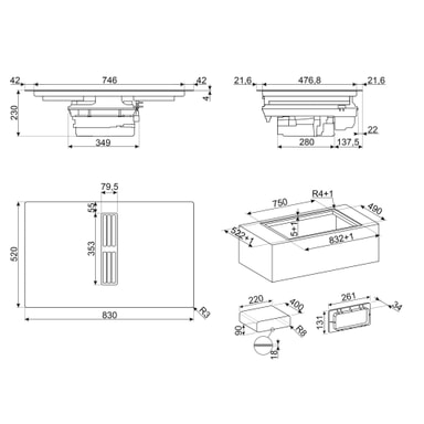 Smeg Universal Universell Platetopp HOBD482D2 Sort. Produktfarge: Sort, Plassering av innretning: Innebygget, Komfyrbredde: 83 cm. Kontrolltype: Rullefelt, Kontrollposisjon: Front, Skjermtype: LED. Type utvinning: Ducted/Resirkulerende, Maksimal utvinningskraft: 500 m³/t, Støynivå: 65 dB. Tilkoplingsverdi (elektrisk): 7620 W, Strøm: 7620 W, Limited connected loads supported: 2800,3500,4500,7400 W. Bredde: 830 mm, Dybde: 520 mm, Høyde: 230 mm