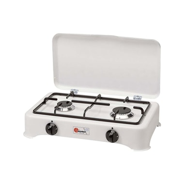 Parker er et frittstående emaljert kokeapparat med 2 bluss for plassering på benk. Lokket beskytter veggen mot søl.
