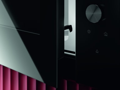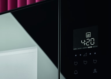 Mikrobølgeovnens minimalistiske design i høyglanset svart matcher ovnen og andre produkter.