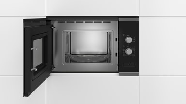 Tilbered, varm opp eller tin maten din med Bosch Series 4 mikrobølgeovn. Den kommer med en plate på 25,5 cm, 5 effektnivå og lys på innsiden.