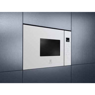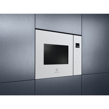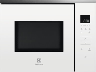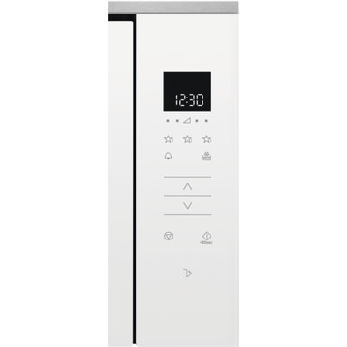 Electrolux 800 TouchOpen mikrobølgeovn for innbygging i hvitt og rustfritt stål. Kun 50 cm bred. Flott, enkelt og nøytralt design som passer til enhver kjøkkenstil og ovndesign. Mikroen betjenes meget enkelt med touch-knapper som kun krever et lett trykk.