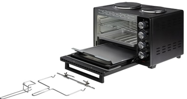 Det kompakte apparatet kommer med to støpejernsplater som kan brukes samtidig som ovnen, hvilket utvider dine matlagingsmuligheter betydelig.