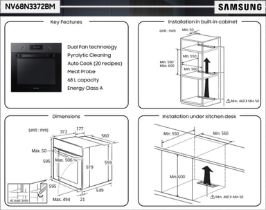 Bak herlige kaker eller tilbered kjøtt og grønnsaker med den pålitelige Samsung integrerte stekeovnen NV68N3372BM. Den har doble vifter, 20 auto-programmer, steketermometer og pyrolytisk rengjøring som gjør vedlikeholdet til en lek.Les mer om produktet