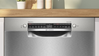 Med bare 42 dB – sammenlignbart med et stille bibliotek – kan du kjøre oppvaskmaskinen uten å forstyrre samtaler, en film eller søvn. Hvis du ønsker å redusere støyen ytterligere, kan du gjøre det eksternt via Silence on Demand-funksjonen i Home Connect-appen, som aktiverer en enda stillere driftsmodus. Det dedikerte Quiet-programmet (41 dB) er perfekt for nattlige kjøringer.