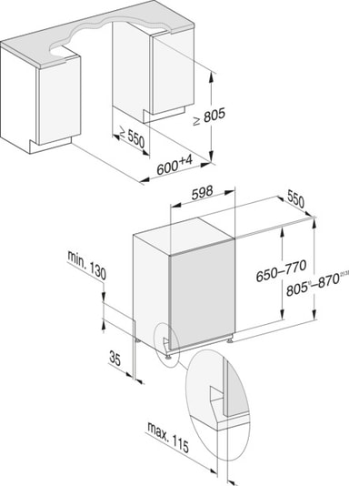 Oppvaskmaskinens justerbare føtter og en maksimal nisjehøyde på 87 cm gjør det enkelt å installere og tilpasse den til kjøkkeninnredningen. Dette sikrer en sømløs integrering i kjøkkendesignen og bevarer rommets estetiske uttrykk. Denne helintegrerte oppvaskmaskinen fra Miele kombinerer funksjonalitet med gjennomtenkt design, og er et pålitelig tilskudd til ethvert moderne kjøkken.